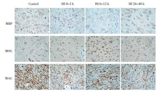 1.3 免疫组化染色 1.3.1 染色过程HI造模完成后,根据分组在相应时间段处死动物,迅速取出脑组织,使用4%多聚甲醛固定,经脱水、二甲苯透明、石蜡包埋后,以冠状面切成4 mm厚的组织片,进行MBP、MOG、MAG(英国Abcam公司)免疫组化染色。置于37 ℃烤箱烤干切片,行常规脱水、透明、封片操作。用PBS代替一抗做阴性对照。