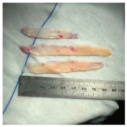1.3.3 切取口腔黏膜碘伏消毒口腔及黏膜,无菌记号笔标记舌下黏膜、颊黏膜或下唇黏膜取材部位。取舌黏膜时要避开舌下腺导管开口,切取颊黏膜时,要避开腮腺导管开口,舌下黏膜单侧最大可取1.5 cm×7 cm,如 > 15 cm的超长段尿道狭窄,可双侧取材,亦可将两侧舌下及舌尖下部分一并选取。肾上腺素生理盐水黏膜下注射(浓度为1∶200 000~1.100 000),后切取黏膜条,创面5-0可吸收缝线间断或连续关闭。注意在取唇黏膜后压迫止血,勿缝合,确需缝合者,术后1 d即拆除缝线,以防术后唇内翻。使用前需剔除黏膜下脂肪及纤维组织备用,见图 3。