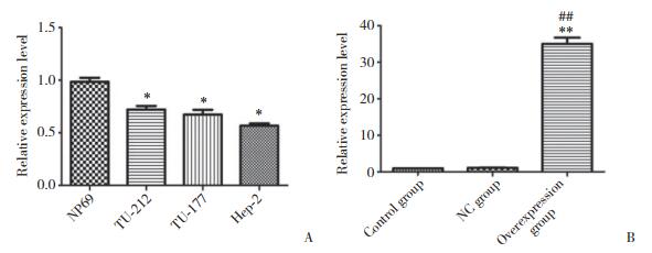 1 材料与方法 1.1 材料人鼻咽上皮细胞NP69和喉癌细胞TU-212、TU-177购自NTCC典型培养物保藏中心,喉癌细胞Hep-2购自中国医学科学院基础医学研究所细胞资源中心,MTT试剂盒购自碧云天公司,RNA提取试剂TRIzol和脂质体Lipofectamine 3000购自美国Invitrogen公司,实时荧光定量PCR引物购自南京金斯瑞公司,逆转录试剂盒和SYBR试剂盒购自北京Genstar公司,信号转导及转录激活因子3(signal transduction and activator of transcription 3,STAT3)抗体、磷酸化STAT3(p-STAT3)抗体和血管内皮生长因子(vascular endothelial growth factor,VEGF)抗体购美国Proteintech公司,GAPDH多克隆抗体购自杭州贤至公司,HRP标记山羊抗兔IgG购自美国Thermo公司,BCA蛋白浓度检测试剂盒、SDS上样缓冲液和ECL发光液购自北京Genstar公司。