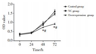 | *P < 0.05 vs control group; # P < 0.05 vs NC group. 图 2 对照组、NC组和过表达组的Hep-2细胞增殖曲线 Fig.2 Proliferation curves of Hep-2 cells in control, NC, and overexpression groups |
