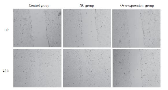 1.6 划痕实验检测细胞迁移能力将转染后的细胞悬液接种于6孔板,1×105/孔,培养过夜,待细胞完全融合后开始划痕实验。用20 μL移液管尖端划伤细胞单层,细胞碎片用PBS冲洗,倒置显微镜下0和24 h时拍照并记录。