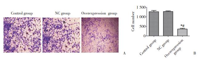 Transwell实验结果显示,过表达组Hep-2细胞的穿膜细胞数低于对照组和NC组(P < 0.05),而对照组与NC组比较差异无统计学意义(P > 0.05)。见图 4。