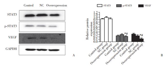 与对照组和NC组相比,过表达组Hep-2细胞的STAT3水平无变化(P > 0.05),p-STAT3和VEGF水平降低(P < 0.05);对照组和NC组比较,STAT3、p-STAT3和VEGF蛋白的表达水平均无统计学差异(P > 0.05)。见图 5。