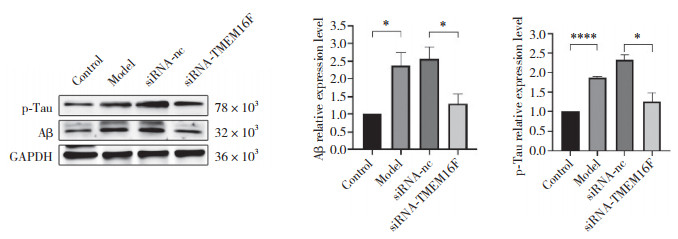 Western blotting结果显示,与Control组相比,Model组中Aβ、p-Tau蛋白表达明显上调;与siRNA-nc组相比,siRNA-TMEM16F组中Aβ、p-Tau蛋白表达显著下降,差异均有统计学意义(均P < 0.05),见图 3。