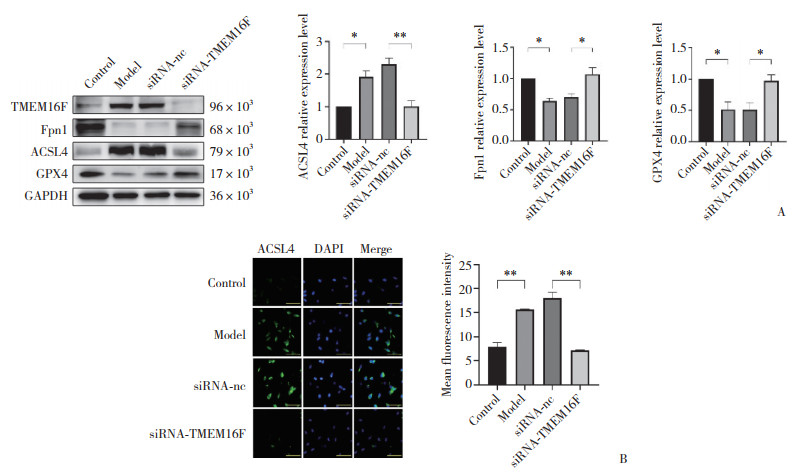 Western blotting结果显示,与Control组相比,Model组中ACSL4蛋白表达增加,GPX4、Fpn1表达降低;与siRNA-nc组相比,siRNA-TMEM16F组中ACSL4蛋白表达下降,GPX4、Fpn1表达明显增加,差异均有统计学意义(均P < 0.05),见图 4A。免疫荧光染色结果显示,Model组中ACSL4表达较Control组明显增加,siRNA-TMEM16F组较siRNA-nc组显著降低,差异有统计学意义(P < 0.01),见图 4B。