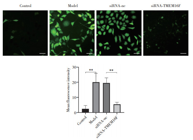 结果显示,与Control组相比,Model组ROS水平明显增加;与siRNA-nc组相比,siRNA-TMEM16F组ROS水平明显下降,差异有统计学意义(P < 0.01),见图 5。