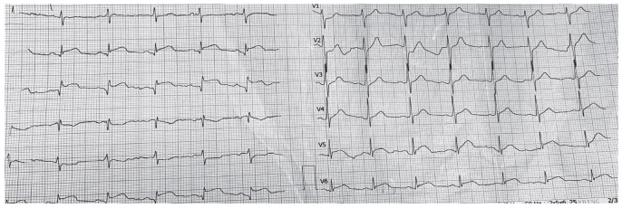 1 临床资料患者,男,32岁,暴露于柳絮数分钟后,出现周身皮疹瘙痒、呼吸困难、头晕,就诊于当地村卫生室。血压70/50 mmHg,考虑过敏性休克,予以地塞米松15 mg静脉注射。数分钟后转诊至当地县医院,患者神志欠清,血压60/40 mmHg,予以肾上腺素0.5 mg肌肉注射、地塞米松5 mg静脉注射,开通静脉通路、吸氧,10 min后患者血压降至40/20 mmHg,心率30~50次/min,末梢血氧75%,予以持续快速补液、阿托品1 mg静脉注射、甲强龙80 mg静脉滴注、多巴胺3~5 μg·kg-1·min-1静脉泵入持续升压等治疗。10 min后患者神志转清,皮疹消失,血压90/60 mmHg,末梢血氧100%,心率60次/min。患者苏醒后主诉胸痛,转诊至我院急诊。
