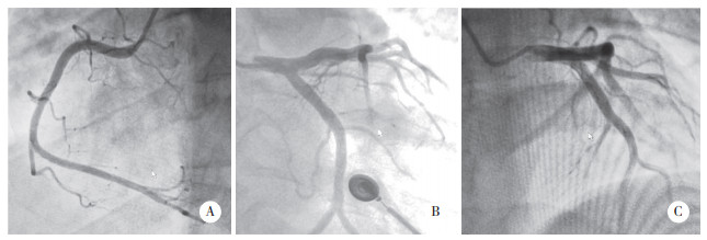 | A,右冠状动脉未见异常;B,左主干、回旋支、前降支未见异常(收缩期可见轻度肌桥);C,前降支、回旋支未见异常. 图 2 急诊冠状动脉造影结果 |