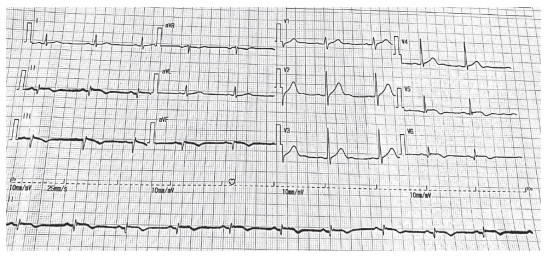急诊冠状动脉造影结束后,患者于我院心血管内科住院治疗。24 h内完善心脏超声,提示左心室射血分数为61%,各心腔内径在正常范围,左心室各壁向心运动良好,未见节段性运动异常;各瓣膜开放和关闭良好,各瓣口前向血流速度在正常范围,二、三尖瓣探及微量反流;心包腔未见液性暗区。完善血液、生化及常规检查:入院连续3 d监测肌酸激酶同工酶,分别为52.2、114.0、18.2 ng/mL(0~7.2 ng/mL);入院连续3 d监测肌钙蛋白Ⅰ,分别为21.21、33.36、14.44 ng/mL(0~0.26 ng/mL);入院急检肝功能:谷丙转氨酶78 U/L(9~50 U/L);γ-谷氨酰转肽酶119 U/L(10~60 U/L);入院连续4 d监测D-二聚体,分别为2.90、0.36、0.22、0.27 μg/mL(0~0.50 μg/mL);凝血四项、甲状腺功能和血气分析正常,冠状动脉CT未见明显异常。追问病史,患者发病前无特殊不适,既往身体状况良好,否认药物过敏史,否认冠状动脉粥样硬化性心脏病史。吸烟20年,20~30支/d。冠状动脉造影围术期给予阿司匹林、替格瑞洛、低分子肝素,住院期间予以他汀和营养心肌等对症支持,予以氯雷他定10 mg(1次/d)、盐酸地尔硫卓缓释胶囊90 mg(2次/d)。住院第3天复查心电图(2019年5月10日14:33),提示Ⅱ、Ⅲ、aVF、V5-6导联可见ST段回落,基线T波倒置(图 3)。