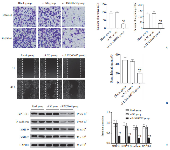 A, the effect of si-LINC00662 on the invasion and migration of SGC-7901 cells (crystal violet stain × 200);B, the effect of si-LINC00662 on the scratch healing of SGC-7901 cells; C, the protein expression of MMP-2, MMP-9, N-cadherin, and MAP3K1. *P < 0.05 compared with the blank group; #P < 0.05 compared with the si-NC group. 图 1 LINC00662抑制对胃癌SGC-7901细胞侵袭、迁移的影响 Fig.1 Effect of LINC00662 inhibition on the invasion and migration of gastric cancer SGC-7901 cells |