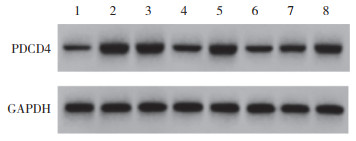 | 1, NC group; 2, H/R group; 3, si-NC group; 4, si-SNHG1 group; 5, mimic NC group; 6, miR-145-5p mimic group; 7, si-SNHG1+inhibitor NC group; 8, si-SNHG1+miR-145-5p inhibitor group. 图 1 Western blotting检测各组细胞中PDCD4蛋白的表达 Fig.1 PDCD4 protein expression detected by Western blotting in each study group |
