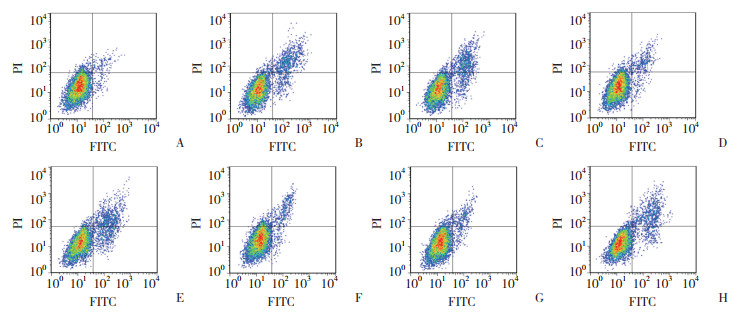 | A, NC group; B, H/R group; C, si-NC group; D, si-SNHG1 group; E, mimic NC group; F, miR-145-5p mimic group; G, si-SNHG1+inhibitor NC group; H, si-SNHG1+miR-145-5p inhibitor group. 图 2 流式细胞术检测H9c2细胞凋亡 Fig.2 H9c2 cell apoptosis detected by flow cytometry |