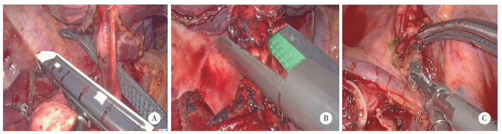 1.3 手术过程手术设备均采用日本Olympus胸腔镜系统,手术均由同一组医生完成,3D组术者和器械护士需佩戴3D眼镜。麻醉成功后,患者取侧卧位,术区常规消毒铺单。采用单孔手术方式。利用超声刀、电钩、吸引器分离黏连,探查胸腔,根据肿物位置游离下肺韧带,显露肺静脉和肺动脉及其分支,利用45或60 mm腔镜切割闭合器进行切断。显露支气管及其分支,随后嘱麻醉师膨肺,确认肺复张后,切断支气管,同时避免损伤膈神经、迷走神经、心包等重要毗邻解剖结构。常规进行淋巴结清扫术。3D组手术过程见图 1。