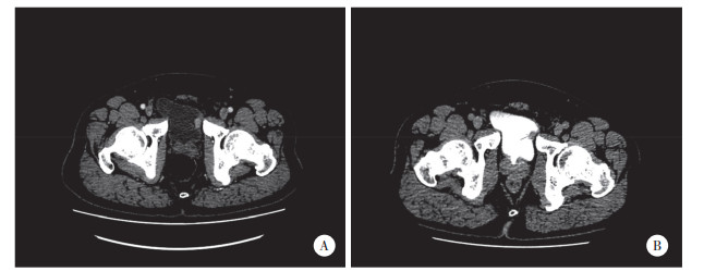 | A,动脉期;B,延迟期. 图 2 术前CTU检查见膀胱左侧壁软组织肿块 |