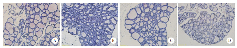 | 图 2 各组代表性甲状腺组织免疫组化染色结果 ×400 Fig.2 Representative immunohistochemical staining results of thyroid gland in different groups ×400 |