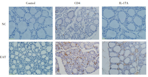 1.3.4 小鼠甲状腺组织免疫组织化学染色小鼠甲状腺组织制备成4 μm石蜡切片,梯度乙醇脱蜡后用抗原液进行修复,PBS洗涤,分别加入CD4、IL-17A抗体4 ℃孵育过夜,PBS洗涤3遍,二抗室温孵育20 min,最后DAB显色,拍照。为排除组织内源性物质引起的假阳性反应,设置了Control组,除不加一抗用PBS代替外,处理方法与其他待测切片一致。