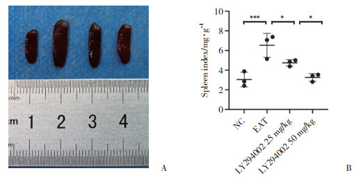 与NC组小鼠相比,EAT组小鼠脾脏体积显著增大,而LY294002组小鼠脾脏体积较EAT组减小(图 3A)。计算各组脾指数,结果显示,EAT组小鼠脾指数显著高于NC组(P < 0.001),LY294002干预后,脾指数明显下降,LY294002 25 mg/kg组小鼠脾指数与EAT组及LY294002 50 mg/kg组相比,均有统计学差异(P < 0.05,图 3B)。