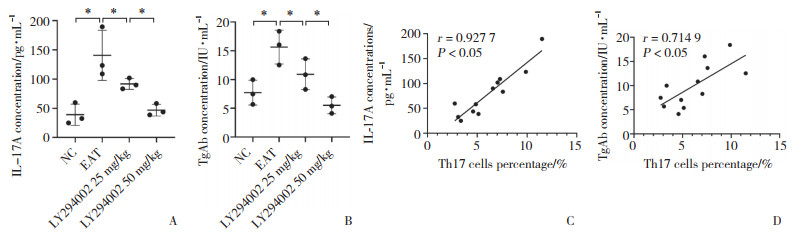 ELISA分析结果显示,EAT组IL-17A(图 5A)及TgAb(图 5B)浓度均较NC组显著升高(P均 < 0.05),LY294002 25 mg/kg组IL-17A及TgAb浓度较EAT组下降(P均 < 0.05),LY294002 50 mg/kg组浓度下降更明显,且与LY294002 25 mg/kg组有统计学差异(P均 <0.05)。将所有实验小鼠血清中IL-17A浓度及TgAb滴度与SMCs中Th17细胞比例进行相关性分析,结果表明两者均与Th17细胞比例呈正相关(图 5C、5D,r = 0.927 7和r = 0.714 9)。