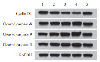 1.2.5 Western blotting检测细胞中cyclin D1及凋亡相关蛋白的表达收集各组细胞,加入RIPA裂解液,14 000 g离心30 min。用BCA试剂盒检测蛋白含量后,10% SDS-PAGE分离蛋白并转移至PVDF膜,5%脱脂牛乳封闭,4 ℃孵育过夜加入一抗(cyclin D1稀释1︰250,cleaved caspase-8、cleaved caspase-9、cleaved caspase-3稀释1︰2 000),室温孵育2 h。羊抗兔IgG二抗(1︰500稀释)室温下孵育2 h。ECL显色。以GAPDH为内参。凝胶成像仪成像,用Image J软件分析计算蛋白相对表达量。