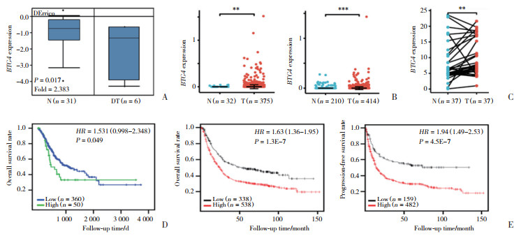 1 材料与方法 1.1 生物信息学分析 1.1.1 Oncomine 4.5数据库(https://www.oncomine.org)使用R软件(4.2.1版本)下载Oncomine数据库中DErrico数据,比较正常和胃癌组织中BTG4 mRNA表达水平,所有数据都进行对数转换,计算每组数据的平均值,并对所有数据进行归一化处理。