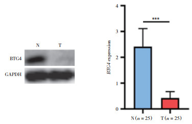 | *** P < 0.001. N, normal tissue; T, tumor. 图 2 Western blotting检测胃腺癌组织中BTG4蛋白表达 Fig.2 BTG4 protein expression in gastric adenocarcinoma using Western blotting |