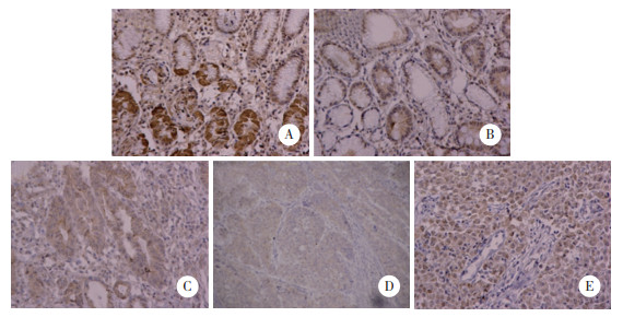 | A, gastritis; B, intestinal metaplasia; C, well-differentiated; D, moderately-differentiated; E, poorly-differentiated. 图 3 免疫组化检测BTG4在胃组织中的表达×200 Fig.3 BTG4 positive expression in gastric tissues using immunohistochemistry×200 |