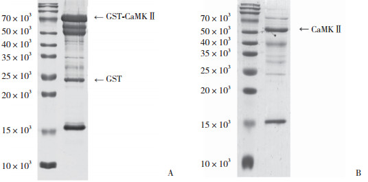 | A,purified GST-CaMKⅡ;B,purified CaMKⅡ after PreScission GST treatment. 图 2 SDS-PAGE电泳鉴定GST-CaMKⅡ和CaMKⅡ蛋白 Fig.2 GST-CaMKⅡ and CaMKⅡ proteins identified using SDS-PAGE |