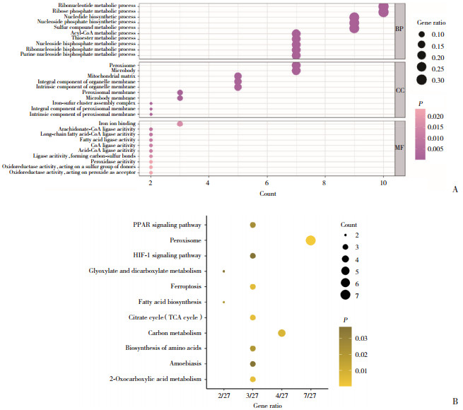 2.4 GO和KEGG富集分析对筛选出的38个DIC与铁死亡交集基因进行功能注释(图 3),发现其在生物过程(biological process,BP) 中主要参与核糖核苷酸代谢过程、核糖磷酸代谢过程、核苷酸生物合成过程、核苷酸磷酸生物合成过程、含硫化合物代谢过程等;细胞组分(cellular component,CC) 显示其主要存在于过氧化物酶体、微体、线粒体基质、细胞器膜的组成部分、细胞器膜的内在成分等;在分子功能(molecular function,MF) 上,其主要在铁离子结合、花生四烯酸辅酶A连接酶活性、长链脂肪酸辅酶A连接酶活性、脂肪酸连接酶活性、辅酶A连接酶活性中发挥作用。KEGG富集分析显示其参与过氧化物酶体增殖物激活受体信号通路、过氧化物酶体、铁死亡、脂肪酸生物合成、柠檬酸循环等信号通路。