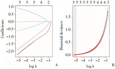 | A,the variation characteristics of the variable coefficients;B,the selection process of the optimum value of the parameter λ in the Lasso regression model by cross-validation method. 图 5 对差异基因的lasso算法分析 Fig.5 LASSO algorithm analysis of the DEGs |