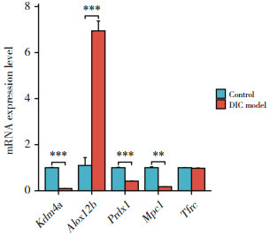 实时PCR结果表明,与正常组相比,DIC模型组Mpc1、Prdx1和Kdm4a显著下调(P < 0.001),Alox12b显著上调(P < 0.001),而2组比较Tfrc无统计学差异(P > 0.05),见图 6。