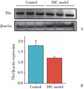 | A,band diagrams of Tfrc protein;B,comparison of Tfrc/β-actin expression. 图 7 Western blotting检测各组中Tfrc蛋白的表达 Fig.7 Western blotting analysis of Tfrc protein expression in each group |