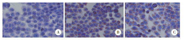 | A, control group; B, model group; C, Danlou tablet group. 图 1 油红O染色检测细胞内脂滴累积×400 Fig.1 Intracellular lipid droplet accumulation detected by oil red O staining × 400 |