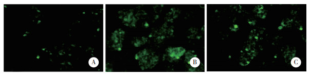 | A, control group; B, model group; C, Danlou tablet group. 图 2 DCFH-DA荧光探针检测细胞内ROS水平×200 Fig.2 Intracellular reactive oxygen species levels detected by DCFH-DA fluorescent probe ×200 |