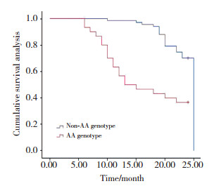 2.4 Kaplan-Meier曲线分析结果PCSK9基因rs562556基因型为AA的T2DM合并AMI患者在PCI术后2年随访期间发生MACE的风险显著增加(P < 0.05),见图 1。