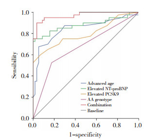 用ROC曲线分析各危险因素对T2DM合并AMI患者PCI术后2年发生MACE的预测准确度,结果显示,高龄、NT-proBNP和PCSK9水平升高及rs562556基因多态性(AA型)对PCI术后2年发生MACE具有良好的预测价值。在PCI术后2年随访期内,rs562556基因型AA联合高龄和NT-proBNP、PCSK9高水平对MACE的预测价值比单独指标的预测价值更高。见图 2和表 4。