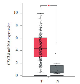2 结果 2.1 CXCL8在宫颈癌组织和正常组织中的表达GEPIA在线分析结果显示,与正常宫颈组织相比,宫颈癌组织中CXCL8表达显著升高(log2FC=3.827,P < 0.05),见图 1。