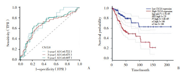 ROC曲线下面积(area under the curve,AUC)是衡量模型预测性能的重要指标,其值越接近1,表明模型的判别能力越强。基于TCGA数据库的ROC曲线分析结果显示,1年、3年、5年总生存期预测的AUC值分别为0.722、0.673、0.697(图 2A),表明CXCL8表达水平对宫颈癌患者OS具有良好的预测能力(AUC值均 > 0.6)。GEPIA在线分析结果显示,CXCL8表达水平与患者OS显著相关,高表达组患者生存期较低表达组缩短(HR = 2.9,P < 0.001,图 2B),提示CXCL8高表达与宫颈癌患者不良预后密切相关。