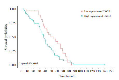 结果显示,94例患者中位OS为36.09(20.17~54.20)个月。CXCL8低表达患者中位OS为44.17(31.68~65.71)个月,CXCL8高表达患者中位OS为31.61(15.46~47.64)个月,2组OS比较差异有统计学意义(Z = -2.69,P = 0.007)。进一步Kaplan-Meier生存曲线分析结果显示,CXCL8高表达患者预后较低表达组患者差(P < 0.05),见图 4。