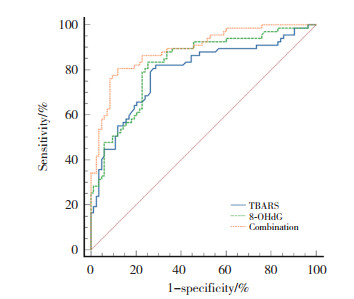 2.7 血清TBARS和8-OHdG水平对抑郁症患者认知功能障碍的诊断价值以患者血清TBARS和8-OHdG水平为检验变量,绘制其诊断抑郁症患者伴发认知功能障碍的ROC曲线。结果显示,患者血清TBARS和8-OHdG单独诊断的曲线下面积(area under the curve,AUC)分别为0.791(95%CI:0.717~0.853)和0.825(95%CI:0.754~0.882),截断值分别为9.42 μmol/L和57.97 ng/L。二者联合诊断时,AUC为0.891(95%CI:0.829~0.936),明显优于血清TBARS和8-OHdG单独诊断(分别为Z二者联合-TBARS=2.911,P = 0.004;Z二者联合-8-OHdG=2.575,P = 0.010)。见表 2、图 1。