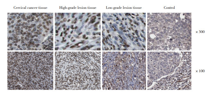 HE染色及免疫组织化学检测结果显示,MDM2主要定位于细胞核,在宫颈癌组织、高级别病变组织、低级别病变组织、对照组中的阳性表达率分别为90.00%(45/50)、64.00%(32/50)、57.50%(23/40),5.00%(2/40),MDM2在宫颈癌组织中的阳性率高于其他3组,差异有统计学意义(χ2=9.447,P < 0.05)。见图 3、4。