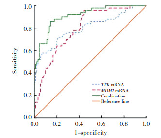 | 图 5 TTK和MDM2 mRNA对宫颈癌的诊断价值 Fig.5 Diagnostic value of mRNA levels of TTK and MDM2 in cervical cancer |