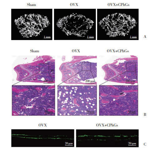 2 结果 2.1 CPhGs可减轻卵巢切除导致的小鼠骨质疏松micro-CT结果(图 1A)显示,与Sham组相比,OVX组小鼠股骨远端出现严重骨微结构破坏,表现为骨小梁稀疏断裂;OVX+CPhGs组小鼠骨小梁数量和连接性显著恢复,接近Sham组水平。结果表明,CPhGs可减轻卵巢切除引起的骨质流失。HE染色结果(图 1B)进一步证实,OVX组小鼠骨小梁数量较Sham组减少,残余小梁变细、断裂;OVX+CPhGs组小鼠骨小梁数量较OVX组增加,结构完整性明显改善。钙黄绿素双标记实验结果(图 1C)显示,OVX组荧光带模糊,间距窄,提示骨形成受到抑制;OVX+CPhGs组荧光带清晰且间距显著增宽,表明CPhGs促进骨基质矿化速率,显著增强新骨形成能力。