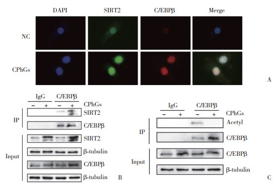 | A, immunofluorescence analysis of SIRT2 (red) and C/EBPβ (green) in CPhGs-treated MC3T3-E1 cells (×200);B, co-immunoprecipitation (co-IP) analysis of SIRT2-C/EBPβ interaction; C, acetylation level of C/EBPβ detected by pan-acetyllysine antibody after IP purification.Effect of CPhGs on SIRT2 and C/EBPβ and its mechanism 图 2 CPhGs对SIRT2和C/EBPβ的影响及作用机制 |