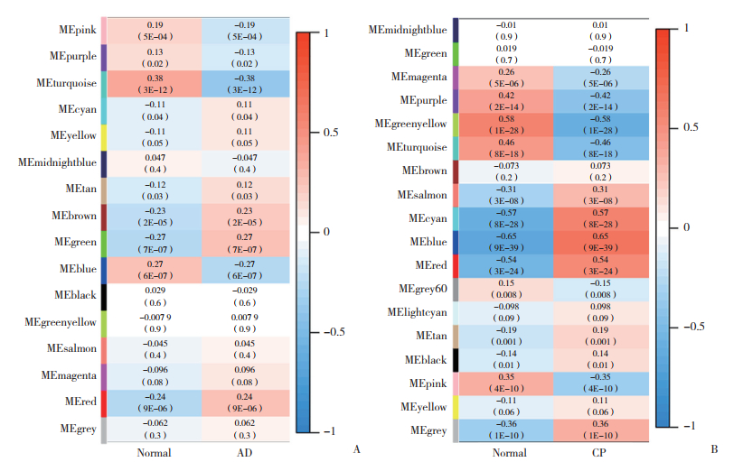 | A, the interconnections between the various modules and traits in AD, the correlation coefficients and P are contained in each cell; B, associations between modules and traits in CP, correlation coefficients and P are included in each cell. 图 1 加权基因共表达网络分析 Fig.1 Weighted gene co-expression network analysis |