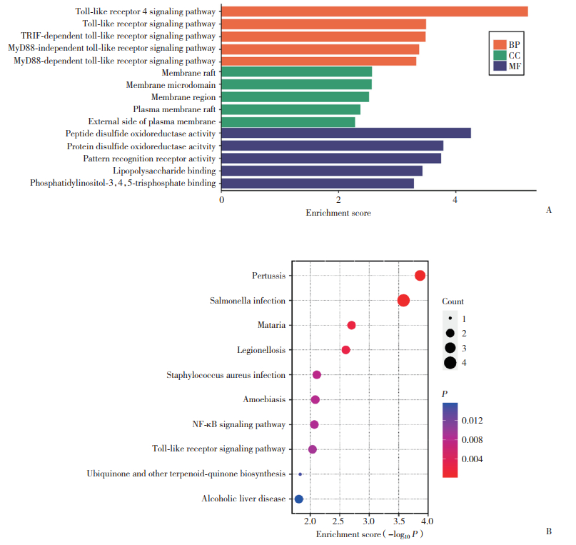 对AD和CP的共同DEGs分别进行GO和KEGG富集分析,BP结果显示,DEGs与Toll样受体信号通路、程序性坏死细胞死亡和模式识别受体信号通路密切相关;CC结果显示,DEGs主要富集于细胞膜相关过程;MF结果显示,DEGs在氧化还原酶活性、脂多糖结合和模式识别受体活性等过程中可能发挥重要作用(图 2A)。此外,KEGG富集分析结果表明,这些DEGs主要富集于菌群感染、NF-κB信号通路、Toll样受体信号通路和酒精性肝疾病通路(图 2B)。