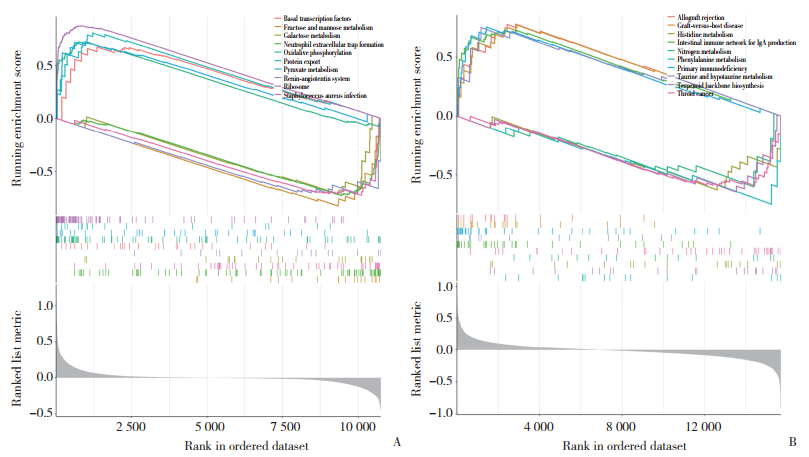 1.8 基因富集分析(gene set enrichment analysis,GSEA)根据关键DEGs的中位表达水平将样本分为高表达组和低表达组,使用R语言“clusterProfiler”包进行GSEA。通过R语言“enrichment”包对结果进行可视化处理。