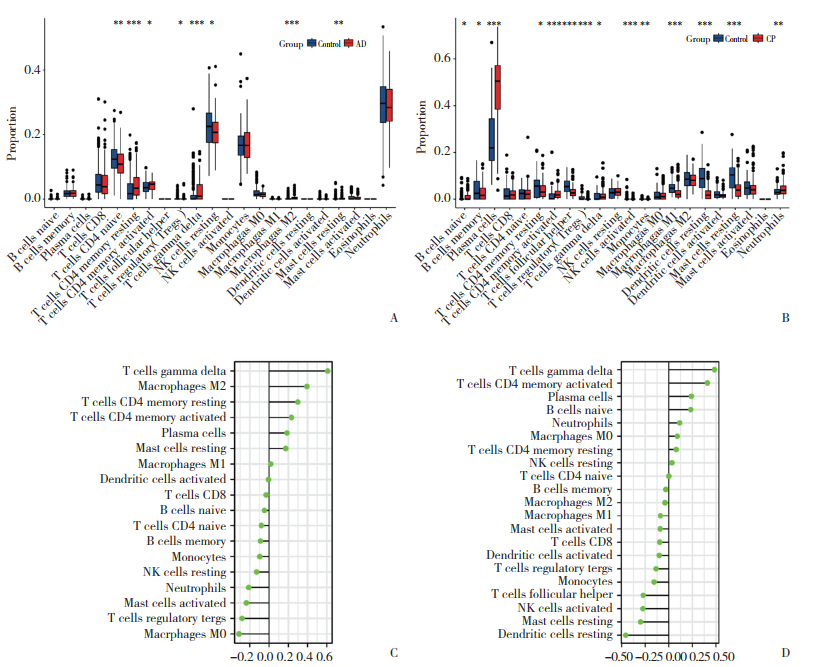 1.9 免疫浸润分析通过CIBERSORT算法对AD和CP样本进行免疫分析,使用CIBERSORT算法进行100次迭代,基于LM22基因标记量化了22种不同类型的免疫细胞。对患病和正常样本的免疫细胞浸润进行了比较分析。采用Spearman等级相关系数对关键共同基因表达水平与浸润免疫细胞数进行相关性分析。