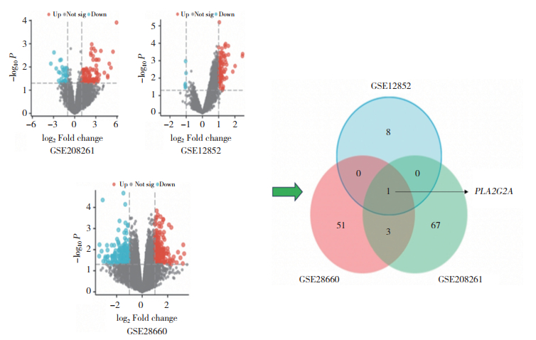2 结果 2.1 GEO数据集筛选差异基因将数据集GSE12852、GSE28660、GSE208261中POP组及对照组取差异基因,结果显示,PLA2G2A在3个数据集的POP组中均呈显著高表达。见图 1。