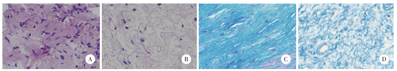 | A, HE staining of control group; B, HE staining of POP group; C, Masson staining of control group; D, Masson staining of POP group. 图 2 2组阴道壁组织学特征 ×400 Fig.2 Histological characteristics of the vaginal wall in the two groups ×400 |
