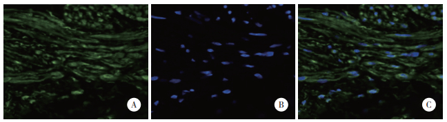 | A, collagen fibers and specific expression; B, nuclei; C, specific localization. 图 3 PLA2G2A在阴道壁组织中的定位 ×400 Fig.3 Localization of PLA2G2A in vaginal wall tissue ×400 |